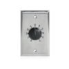 High-quality auto transformer AT100-PA provides the advantages of excellent frequency response, low insertion loss and reliable performance for volume control application in 25 and 70.7-volt systems. Attenuation is accomplished in ten make before break steps plus positive off position. (No stop between maximum and off position to prevent switch damage). Contacts are silver plated for noise-free operation. Features a removable terminal block. Includes stainless steel plate, with stamped and filled or screen printed dial scale and a skirted black knob.