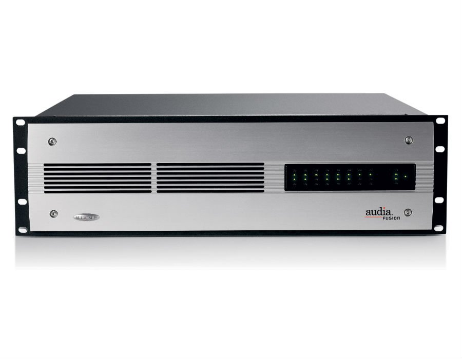 AudiaFUSION is a modular networked amplifier capable of supporting up to 8 amplifier cards, each of which are individually software configurable from 100-600 watts for up to 2400 watts of power. AudiaFUSION allows you to configure decentralized systems, placing components close to speakers for reduced labor and material costs. When you install AudiaFUSION in a system with AudiaFLEX, processing resources are shared.