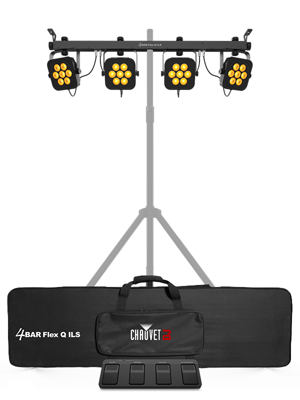 The complete convenience of wash lighting reaches new heights with 4BAR Flex Q ILS. This all-in-one system is equipped with four pair luminaires on one bar. Because the 4BAR Flex Q ILS supports Instant Light Show (ILS) which makes creating coordinated light shows on an unlimited number of different rigs quick and easy, generating synchronized light shows without DMX is even more easy. High-intensity quad-color (RGBA) LEDs generate a wide spectrum of colors and achieve natural-looking color temperatures with their striking amber LEDs. 4BAR Flex Q ILS easily sets up and dismantles in minutes and includes a handy carry bag. Adding to the versatility of the unit, there are two L-brackets that allow you to maximize installation possibilities and configurations. Easily mount up to 4 additional fixtures on top of the 4BAR Flex Q ILS and power additional lights using the built-in Edison sockets. 4BAR Flex Q ILS mounts to most tripods or speaker stands, without the need for additional clamps, using the pass-through hole. USB D-Fi™ compatibility for wireless master/slave or DMX control is built-in and multiple control options include standalone mode, DMX, wireless footswitch or IRC-6.