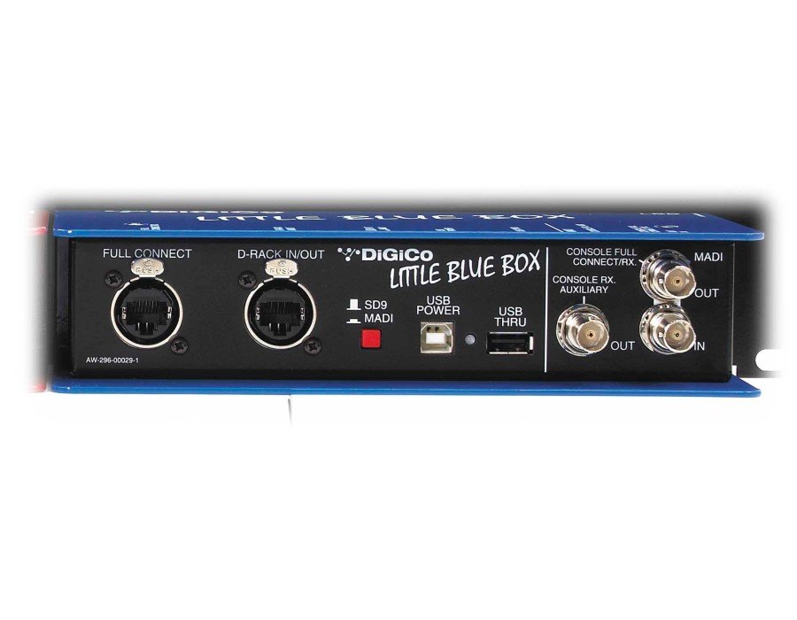DiGiCo’s Little Blue Box, allows you to connect an SD9, SD11, D-Rack and MADI console (SD8, SD7 or even a D-Series), thus allowing you to share a D-Rack between two or three consoles. The SD9 / MADI switch allows you to select between the SD9 (or SD11), or whatever console is plugged in to the MADI connector to control the D-Rack. The Console RX. Auxiliary output is designed to be the redundant run on an SD8 or SD7. Alternatively, it could be split off to another console with one SD9 (or SD11) using a CAT5 connection and one MADI pair for the SD8, which could then feed off to a recorder or another console.