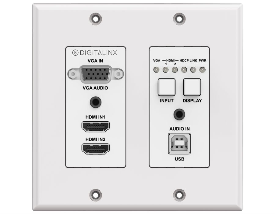 The DigitaLinx DL-2H1V1U-WP-W is a 3×1 auto switching HDBaseT 2.0 transmitter that supports the long distance transport of HDMI, VGA and High Speed USB 2.0 signals up to 100 meters / 330’ using category cabling. The DL-2H1V1U-WP-W is 4K compatible with a max resolution of 4K@60Hz / 4:2:0 8bit deep color. An additional analog audio pass through input is located on the wall plate that allows for audio distribution to the HDBaseT receiver side. With 48V integrated PoH, the DL-2H1V1U-WP-W can be powered via HDBaseT receiver with a PSE module or the wall plate can be powered by a local power supply.