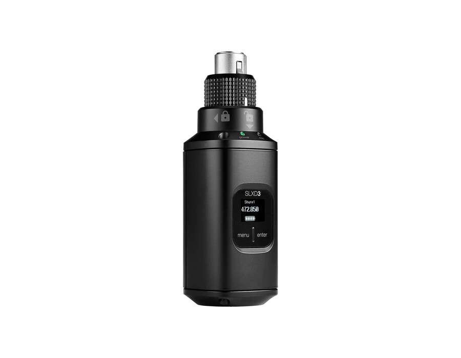 SLXD3 Plug-On Digital Wireless Transmitter converts any XLR sources, including dynamic and condenser microphones, for use as SLX-D wireless transmitters. Featuring a patented locking ring for a seamless, secure connection, the SLXD3 sends 24-bit digital audio from any XLR source to an SLXD4 or SLXD5 Wireless Digital Receiver over a robust RF connection. Use IR Sync to quickly and easily pair transmitters with the SLX-D wireless receiver of your choice. A full set of optional rechargeable accessories enables wireless excellence, wherever needed, and the bright OLED display shows battery life in hours and minutes, when used with the optional SB903 Rechargeable Lithium-Ion batteries. Includes the SLXD3 plug-on transmitter, a pair of AA alkaline batteries, and a protective leather case with integrated belt clip.