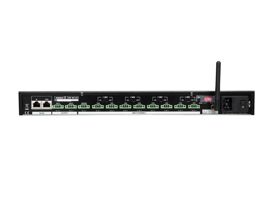 All inputs have switch to enable the connection of +48V phantom power supply microphones. The two features that represent an interesting development are the Auto-mixer functionality and the RS485 interface for external commands.